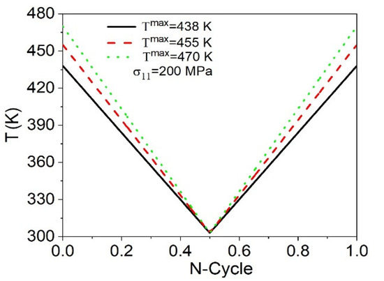 After this comparison, numerical simulations are conducted to verify the influence of the temperature loadings on the fatigue life of the SMAs. It is important to notice that thermomechanical couplings imply that the loading rate can influence the SMA response. Additionally, phenomena such as transformation induced plasticity and thermal strain have temperature dependent behavior. On this basis, it is expected that the temperature loading process changes the SMA response. In this regard, different tests are performed considering distinct thermal loadings defined by a maximum temperature. Figure 13 shows different thermal loading curves indicating a minimum temperature of 303 K and three maximum temperatures ( T max = 438   K ,   455   K ,   and   470   K ). A constant stress of 200 MPa is applied.