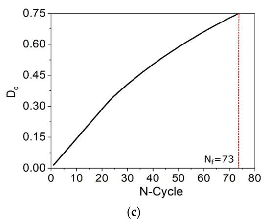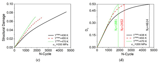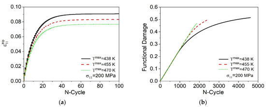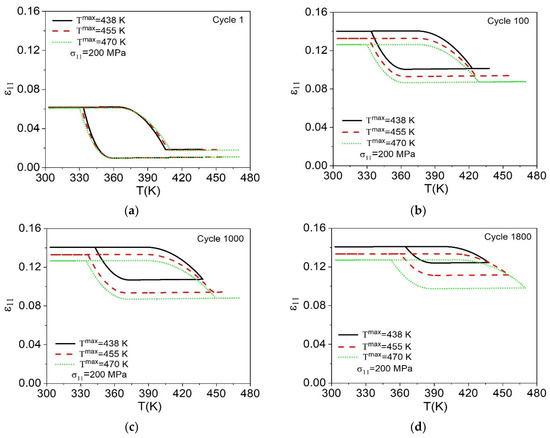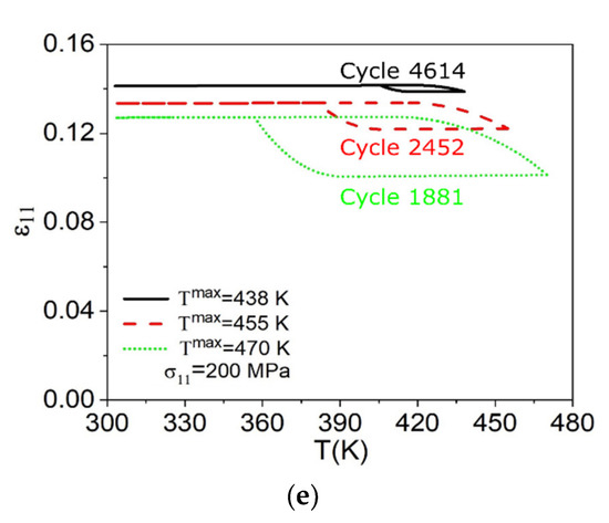 Figure 14 shows the strain–temperature curves considering different cycles: 1, 100, 1000, 1800, and the last cycle until failure, predicted by the model. Initially, the material presents a similar behavior for the three temperatures analyzed, as can be seen in Figure 14a. After a few cycles, an increase in the maximum temperature promotes a reduction of the maximum and residual strain experienced by the material. In addition, an increase in T max of 32 K, associated with the effects caused by the evolution of functional and structural damage, promotes a reduction of the number of cycles to failure (Nf) of approximately 59%, as shown in Figure 14e.