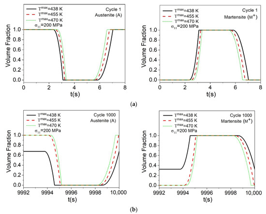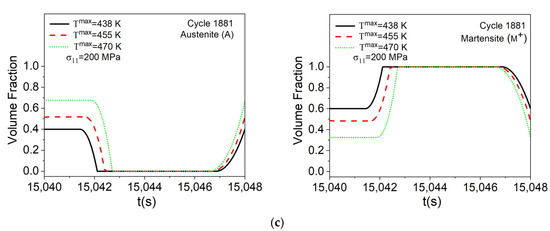 Figure 15 shows the evolution of volume fractions for cycles 1, 1000, and 1881. Initially, the samples have 100% of their phase transformation capacity, as shown in Figure 15a. The maximum temperature directly influences the loss of material performance over the cycles, as can be seen in Figure 15b,c for cycles 1000 and 1881, respectively. For cycle 1000, the material has 100% of its actuation capacity for T max = 455   K   and   470   K , whereas for T max = 438   K a loss of performance of approximately 30% is observed. Finally, for cycle 1881 the material has a loss of actuation of 60%, 50% and 30%, respectively, for T max = 438   K ,   455   K ,   and   470   K .
