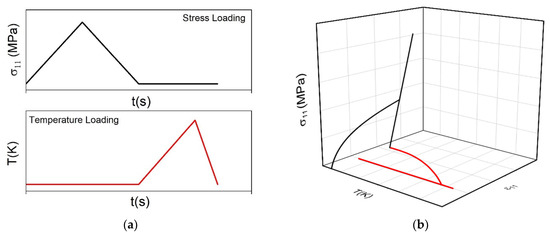 Figure 18. One-way shape memory effect. (a) loading process; (b) stress–strain–temperature response.