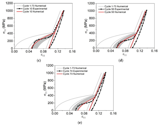 Figure 14. Thermal cyclic test under a constant uniaxial load and different maximum heating temperatures. Numerical comparative results for different cycles: (a) cycle 1; (b) cycle 100; (c) cycle 1000; (d) cycle 1800; (e) last predicted cycles.