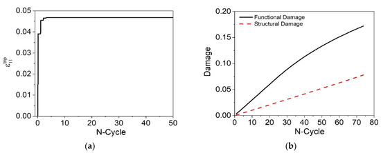 Figure 4a presents the evolution of TRIP showing that the material undergoes a rapid stabilization, around 10 cycles. Figure 4b presents the evolution of functional and structural damage. After 2284 cycles, the functional damage reaches a value of approximately 12%, causing the loss of actuation performance. Concerning structural damage, it is possible to observe a trend of linear evolution reaching approximately 2% in the last cycle before the rupture. Finally, Figure 4c shows the evolution of D c over the cycles until reaching D c c r i t = 0.16 .