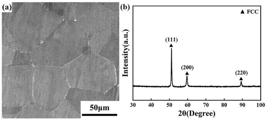 The microstructure of the hot-rolled Fe40Mn20Cr20Ni20 HEAs is shown in Figure 1a. The alloy ingot underwent a dynamic recrystallization process during the hot rolling process. Therefore, the alloy contained equiaxed grain. The XRD pattern of the hot-rolled Fe40Mn20Cr20Ni20 HEAs is illustrated in Figure 1b. It can be observed that all the diffraction peaks of the hot-rolled Fe40Mn20Cr20Ni20 alloy are a single FCC solid solution, and no intermetallic compounds formed. The simple single-phase structure can be ascribed to the high-entropy effect, which is conducive to the formation of simple solid solutions rather than complex intermetallic compounds.