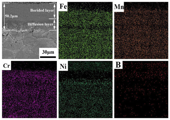 Figure 2 shows the cross-sectional microstructure of the boronized Fe40Mn20Cr20Ni20 HEA, indicating a layered structure. A dense and smooth boronized layer can be observed in the cross-sectional graph. The interface is composed of a boride layer, diffusion layer and matrix based on previous studies [24]. There is no clear demarcation line between the matrix and the boronized layer. Grain boundary precipitations within the matrix are observed. It was indicated that the boron atoms diffused through the grain boundaries and formed the precipitates at the grain boundaries. Furthermore, some cracks appear in the boride layer due to the distinctive thermal expansion coefficients of Fe2B and FeB [27,28]. According to the EDS surface analysis results, the surface of the boronized layer is Ni rich, which can be confirmed with the XRD results. Ni-B compounds are divided into two types, one with less BNi3 and the other with more Ni4B3. Therefore, the sum of these two compounds leads to a higher Ni content. It is well-known that the thickness of the boride layer depends on the boronizing time and temperature. In the present study, the thickness of the boride layer was 50.2 μm. The element distribution diagram of the cross-section of the boronized Fe40Mn20Cr20Ni20 HEA is displayed in Figure 3. The content of boron on the surface is relatively higher and gradually decreases from the surface to the substrate. This is because borides are more easily formed on the surface. The metal elements also show the characteristics of layering. The outermost layer is rich in Ni element, followed by Fe, Cr and Mn. The stratification of the metal elements is due to the different mixing enthalpies with the B element and each metal element.