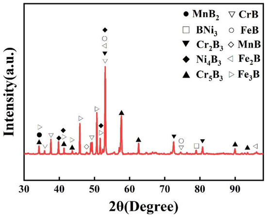 Figure 3 shows the XRD pattern of the boronized HEA. Unlike that of the hot-rolled sample, no FCC structure is detected in the boronized alloy, indicating that the boron and metal elements formed a stable boride layer. It can be observed that the boronized layer mainly displays strong Cr-B and Fe-B phase-diffraction peaks. The boronized layer contains CrB, FeB, MnB, Fe2B, Fe3B, MnB2, BNi3, Cr5B3, Cr2B3, Ni4B3 and other compounds. According to previous studies, the formation mechanism of the boronized layer is as follows [29]: firstly, at the boronizing temperature, boron atoms are transferred to the surface of the materials through gas diffusion and then solid-state diffusion to the sub-surface area; secondly, as the temperature rises, the boron atoms form metal borides with the most active elements; thirdly, the boride layer consists of an outermost boride layer and an intermediate diffusion layer.