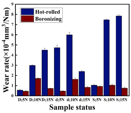 Wear rates of hot-rolled and boronized Fe40Mn20Cr20Ni20 HEAs under different test environments. D symbolizes the dry condition; d symbolizes the deionized water; and S symbolizes the seawater.