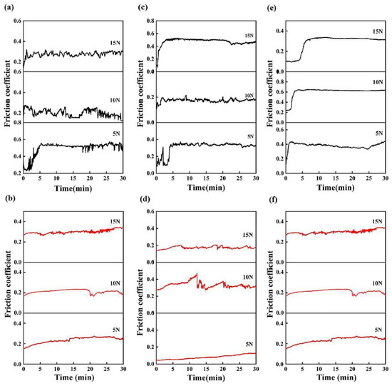 The variation of the friction coefficient in the hot-rolled and boronized Fe40Mn20Cr20Ni20 HEAs with the sliding time at distinctive loads under different environments is displayed in Figure 5. The specific values are summarized in Table 2. The friction coefficient curve can basically be divided into two stages: at the beginning of wear, the friction coefficient increases with time and then reaches a relatively stable value, which is called the running-in period; finally, the friction coefficient fluctuates up and down within a stable range, which is called the stable stage [34].
