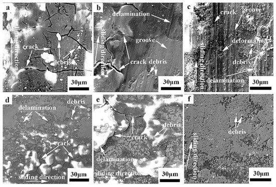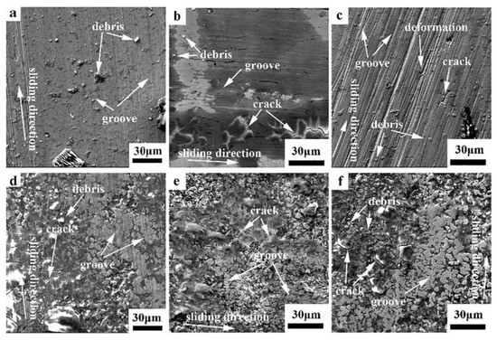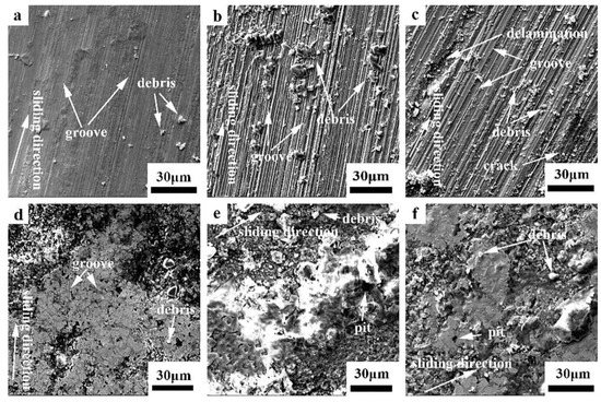 SEM images of the worn surfaces of the hot-rolled and boronized Fe40Mn20Cr20Ni20 HEAs in the deionized water: (a) hot-rolled HEA, 5 N; (b) hot-rolled HEA, 10 N; (c) hot-rolled HEA, 15 N; (d) boronized HEA, 5 N; (e) boronized HEA, 10 N; and (f) boronized HEA, 15 N.