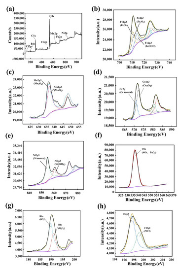 XPS analysis of the worn surface of the boronized HEA in the seawater at 15 N. (a) Full spectrum of the sample (b) Fe element; (c) Mn element; (d) Cr element; (e) Ni element; (f) O element; (g) B element; (h) Cl element.
