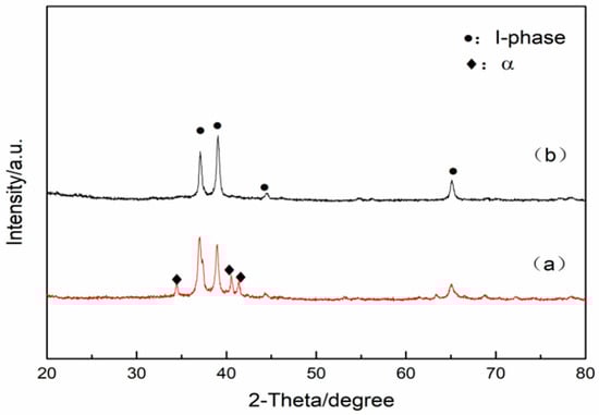 The X-ray diffraction patterns of Ti-40at.%Zr-20at.%Ni alloy prepared by blow-casting and melt-spinning tools are shown in Figure 1. A hump-like a region appeared in all the XRD patterns, which are a result of the XRD sample holder. It can be seen from Figure 1a that the XRD pattern reveals the presence of both icosahedral quasicrystals (I-phase indexed according to Cahn scheme [29]) and α-solid solution phase. The sharp peaks of the icosahedral quasicrystalline phase are around 35–39°, and the strongest diffraction peak of the α-solid solution phase are identified at 34°, 40° and 41°. The weak peak of α-solid solution phase in the XRD measurements (Figure 1a) might be attributed to small grain size or its low content in the alloys. The XRD pattern of the ribbons (as shown in Figure 1b) has a peak index with only the I-phase. The lattice constant of the I-phase of both samples was to be 0.508 nm, conforming to the value quasilattice of this alloy [27], and the α-solid solution phase was calculated as a = 0.311 nm and c = 0.493 nm, respectively.