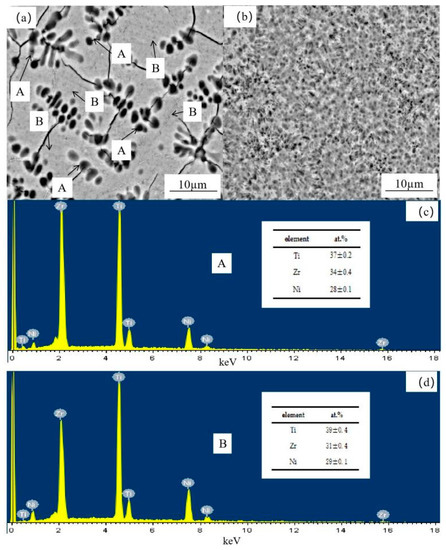 SEM morphology of: (a) The Ti40Zr40Ni20 rod; (b) The Ti40Zr40Ni20 ribbon. The EDS spectrum of the Ti40Zr40Ni20 rod: (c) The α-solid solution phase (A); (d) The I-phase (B).