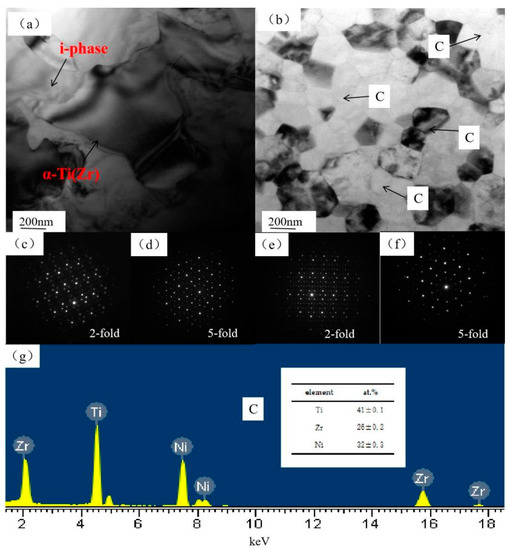 To further confirm the existence of the I-phase, the ribbons were investigated by TEM, as shown by a bright-field electron micrograph from the central zone of the Ti40Zr40Ni20 rod in Figure 3a. The corresponding SAED patterns show the characteristic two-fold and five-fold symmetry of the I-phase at different tilts (shown in Figure 3c,d) corresponding to the X-ray diffraction peaks as indexed (shown in Figure 1a); this demonstrates that the samples maintained a quasicrystal structure. The TEM micrograph of the Ti40Zr40Ni20 ribbons, as shown in Figure 3b, reveals the formation of the I-phase grains with a chemical composition of Ti41±0.1Zr26±0.2Ni32±0.3 ranging from 64–184 nm. The representative SAED pattern of the I-phase reveals more distorted two-fold and five-fold symmetry in Figure 3e,f. Significantly, the grain size of the ribbons is smaller than that of the rod. This is due to the faster cooling of the single-roll ribbon, its greater nucleation rate, and its smaller grain. Totally, no O element was observed in the EDS patterns, indicating that the probability of the bulk oxidation of the rod sample and ribbons was very slight, and further confirming that the vacuum used to produce the sample was sufficient. The alloy composition was found to be close to the nominal stoichiometry taken. The EDS analysis results of the I-phase (C) of the Ti40Zr40Ni20 ribbons in Figure 3b are shown in Figure 3g.