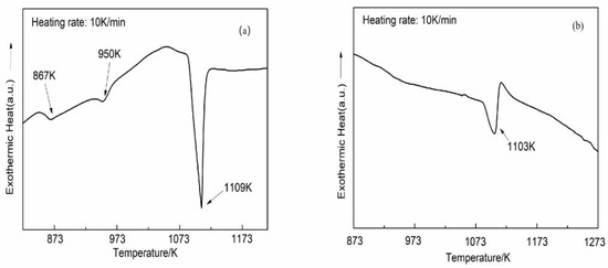 Subsequently, thermal analysis tests were carried out on the Ti40Zr40Ni20 rod and ribbons. Figure 4 exhibits the DSC curve of two specimens with a heating rate of 10 K/min. It can be seen from the DSC curve that there are three endothermic events (867 K, 950 K and 1109 K) of the rod specimen shown in Figure 4a. According to the phase diagram [30] of Ti-Zr-Ni and Qiang et al. [31], during the continuous heating process of the T40Zr40Ni20 rod an isomorphic transition between α-solid solution and β-solid solution occurs first near 867 K, then the I-phase begins to decompose into the C14 phase and the β-solid solution at 950 K. Eventually, near 1109 K, the whole tissue is melted to produce a liquid phase. Based on XRD data, the rod is composed of the I-phase and α-solid solution phase at room temperature. Two endothermic peaks occurred (867 K, 950 K) during the DSC testing process, which is consistent with the two phases calibrated in the XRD pattern.