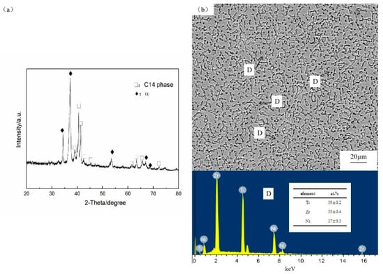 In order to further confirm the formation of the C14 phase, the T40Zr40Ni20 rod was vacuum annealed at 1020 K for 2 h, followed by furnace cooling. The X-ray diffraction spectrum of the annealed sample is shown in Figure 5a; the quasicrystalline phase disappears, the peak strength of the α-solid solution phase increases, and the C14 phase appears. The results of the backscattered electron image and energy spectrum analysis of the annealed tissue are shown in Figure 5b. The gray phase (D) is the C14 phase (Ti39±0.2Zr33±0.4Ni27±0.3), with the MgZn2 structure type [30,32]. The phase transition near each temperature is shown in Table 1.