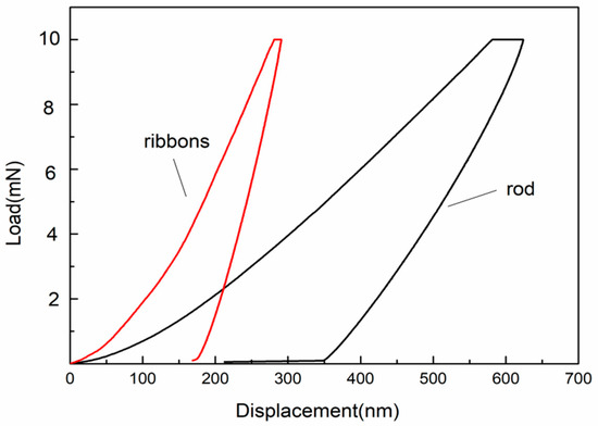 The representative displacement(h)-load(P) for the Ti40Zr40Ni20 rod and ribbons.