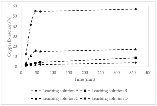 Leaching experiments were performed using leaching solutions A and B (i.e., without hydrogen peroxide). Leaching solutions C and D additionally contained 3 g/L and 15 g/L hydrogen peroxide, respectively. In all experiments, the copper concentrations in the PLS were determined as a function of time.