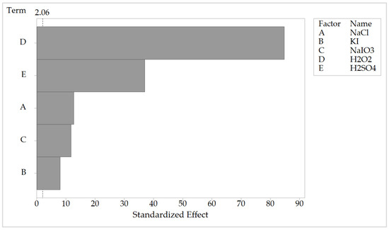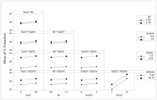 The Pareto chart allows detecting the most influential factor and interaction effect in the leaching process based on the copper extraction results. It displays the absolute value of the standardized effects of different factor combinations in decreasing order. The standardized effects are t-statistics that test the null hypothesis that the effect is zero [51]. The chart also plots a reference line to indicate which effect is statistically significant. In order of importance, the most influential factors in the leaching experiments were the concentrations of hydrogen peroxide, sulfuric acid, sodium chloride, sodium iodate, and potassium iodide. Figure 2 and Figure 3 show that the hydrogen peroxide concentration is the most influential variable in the leaching process and, on average, increases the overall extraction by approximately 25%. The same order of importance was obtained when the evaluated response was the PLS copper concentration (g/L).