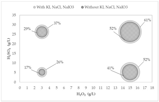 The dark-gray bubbles represent the extraction achieved in leaching solutions without reagents KI, NaIO3, and NaCl, as a function of the acid and hydrogen peroxide concentrations. The lowest extraction is obtained at the lower concentrations of acid (5.3 g/L) and hydrogen peroxide (3 g/L). Increasing the acid concentration in the leaching solution to 26.3 g/L increases the extraction from 17% to 29%, while increasing the hydrogen peroxide concentration to 15 g/L increases the extraction from 17% to 41%. Finally, increasing both the acid and peroxide concentrations increases the extraction to 52%.