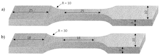 The material was a hot rolled AZ31B magnesium alloy sheet (composition in wt.% Al 2.54%, Zn 1.08%, Mn 0.38% and Mg balance), supplied by Xi’an Yuechen Metal Products Co. Ltd. (Xi’an, China). The tensile and fatigue samples were machined by laser-cutting along the rolling direction following ASTM E8M-16a [26] and ASTM E466-15 [27], respectively. Figure 1 shows the shape and size of the specimens employed for tensile and fatigue tests. The dog-bone shaped specimens were sequentially ground using waterproof silicon carbide paper (from #220 to #4000), and polished using diamond paste slurry (diameter 3 µm and 1 µm). Right after, they were cleaned using deionized water and ethanol, being dried in a warm air stream provided by a conventional heat gun.