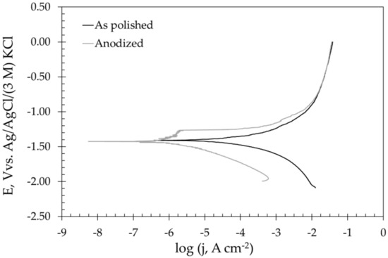 Potentiodynamic polarization curves of the polished and anodized samples tested in PBS solution at room temperature are presented in Figure 3. The values of corrosion potential (Ecorr) and corrosion current densities (jcorr) were determined from the curves using the Tafel extrapolation method. The results are shown in Table 1. The jcorr values were significantly affected by the presence of the anodic film. The dissolution rate of the anodized sample was reduced by one order of magnitude. The anodized layer acted as a barrier layer against electrolyte penetration. However, as seen in Table 1, the produced oxide layer presents an inherent porosity, which could be related to the cracks and cavities observed from the SEM micrographs (Figure 2).