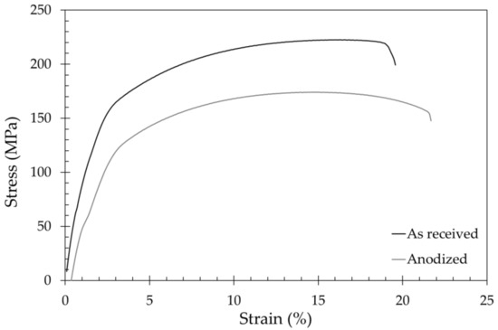 Stress-strain curves in uniaxial tension tests at room temperature for anodized and as received specimens.
