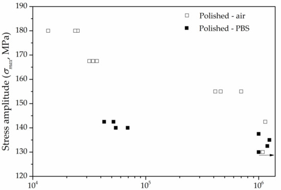 The S-N curves for the anodized specimens exposed to air and PBS solution are shown in Figure 6. Corrosion was less detrimental for the surface treated samples than the polished ones. As displayed in Figure 5, the fatigue life was little affected by the corrosive environment for stress levels lower than 130 MPa.