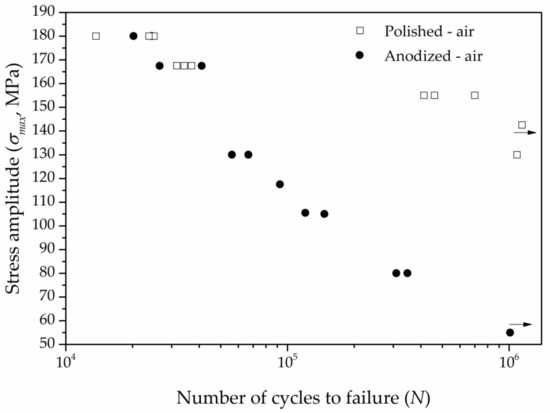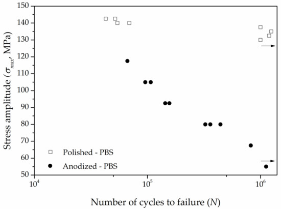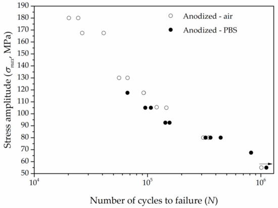Figure 7 and Figure 8 show the S-N curves for the polished and anodized samples exposed to air and PBS solution, respectively. As seen in these figures, there was a remarkable reduction of the fatigue resistance for the anodized specimens compared to the polished condition regardless of the environment. In both scenarios, the reduction of the fatigue limit at 106 cycles was approximately 60% for the anodized samples.