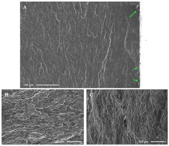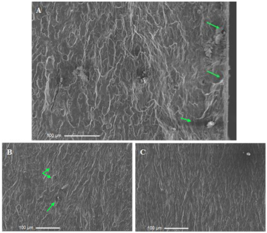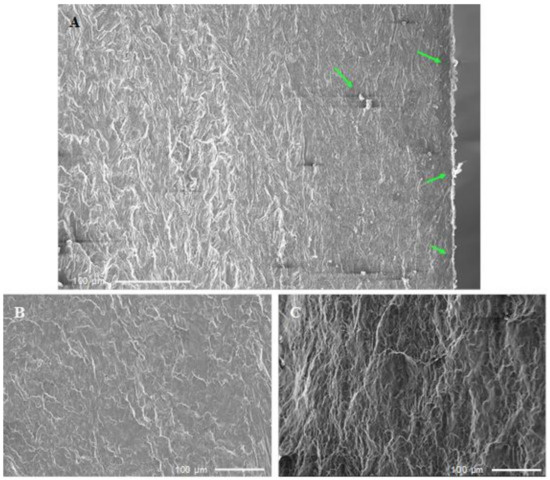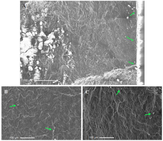 Figure 10 shows the SEM micrographs corresponding to regions A (Figure 10A), B (Figure 10B) and C (Figure 10C) of Figure 9a. Green arrows point to possible crack nucleation sites in Figure 10A, denoted by discontinuities and small particles at the bottom right of the micrographs. However, the nucleation site was not clearly distinguished. A different aspect is seen in the crack growth region (Figure 10B). Faceted regions and shallow dimples are encountered over this region, suggesting an unstable crack growth mechanism was predominant. Conversely, a typical ductile dimpled fracture surface is seen in Figure 10C, suggesting that plastic deformation occurred in this region, before final fracture. Similar features of fractographic aspects of fatigue fracture surfaces of magnesium alloys were reported by other authors [48,49,50,51].