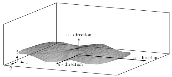 Here, and t are the semi-axes of the ellipsoid, and and are the amplitude, the frequency and the zero phase angle of a corrugation of the ellipsoid along the axis. The longitudinal axes (a-direction) lie in the - plane and the axis is parallel to the c-direction of the hexagonal crystal lattice, which results in . In Figure 1, the schematic representation of a single graphite lamella is shown.