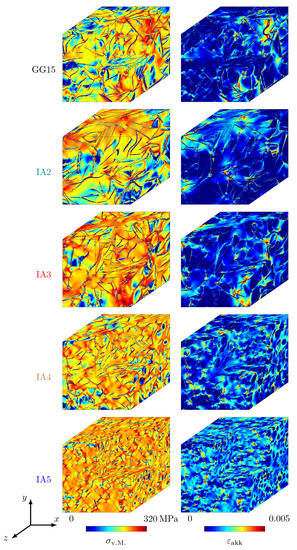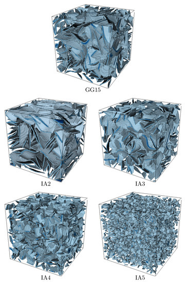 In Figure 4, spatial images of synthetically generated statistical volume elements of the graphite morphologies GJL-150 and IA2 to IA5 are shown, each with a graphite flake volume fraction of 10 . It clearly becomes evident that the number of graphite lamellae in the simulation domains increases from IA2 to IA5 for the same graphite volume fraction as the average size of the graphite particles decreases.