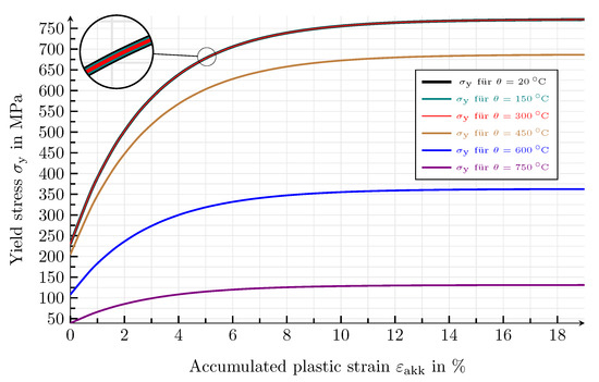 If no explicit reduction factor is given for a specific temperature at which simulations are carried out, linearly interpolated reduction factors with respect to temperature are used. The reduction factor of the Young’s modulus, , is applied to the Young’s modulus of the pearlitic matrix at room temperature, , and the yield strength reduction factor, , to the yield strength at room temperature, . The temperature dependence of the saturation stress, , and the saturation rate, , follow the procedure described in Bonora and Ruggiero [1]. Therein, each yield curve is assumed to be self-similar with respect to the material behaviour at room temperature, where the yield stress, , is scaled with respect to the temperature-dependent yield strength. In Figure 5, the plastic flow curves are shown at different temperatures.