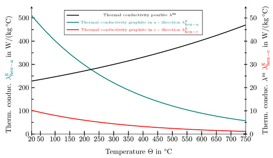 The thermal conductivity of pearlite has a weak transverse isotropy with regard to the orientation of the ferrite and cementite lamellae of a single pearlitic colony. Compared to the anisotropy of graphite, however, this anisotropy is negligible and is therefore not modelled. In Figure 6, the temperature-dependent isotropic thermal conductivity of the pearlitic matrix, , is shown.