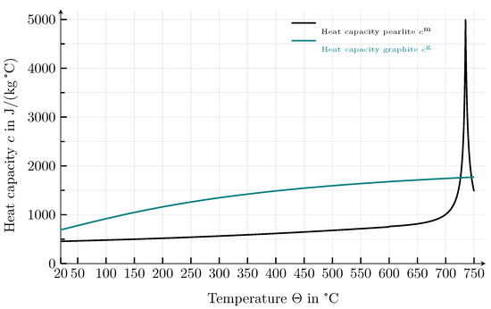 The parameters correspond to typical values of a eutectoid Fe-C system, with a carbon mass fraction of , taken from Helsing and Grimvall [34]. As the temperature-dependent specific heat capacity of the pearlitic matrix, values of steel given in Eurocode [31] are used, , as shown in Figure 7.