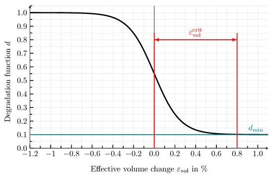 Using the first invariant of the strain tensor, , the volume change of a material point is defined. The degradation function assumes its maximum value for and its minimum value, , for . The threshold value of the volume change, , defines the transition width between the minimum and maximum value of the degradation function. Due to the fact that tensile stresses are characterised by positive volume changes, for the threshold value of the volume change, applies. An exemplary representation of the course of the degradation function is shown in Figure 8, where the meanings of the various function parameters are given.