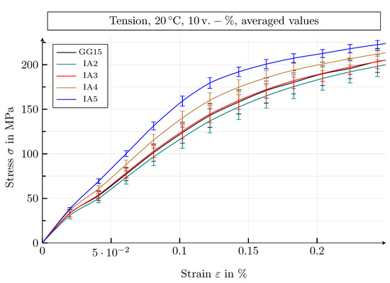 In Section 2, it is explained that cast iron with lamellar graphite behaves isotropically in macroscopic experimental tests. This is not the case for the SVEs used, as the simulation domains do not contain a sufficient number of transversely isotropic graphite particles for their anisotropy to be statistically eliminated. To investigate how strongly anisotropic the SVEs are, tensile tests are carried out on three different graphite morphologies of the SVEs IA2, IA3, IA4 and IA5, each with a graphite flake volume fraction of 10 and at room temperature, θ = 20 °C. Figure 9 shows the resulting stress–strain diagrams under one-dimensional, moment-free tensile loading of each of the three variants of a graphite class. The corresponding standard deviations of the different graphite morphologies are given as a measure of anisotropy, in the form of error bars.