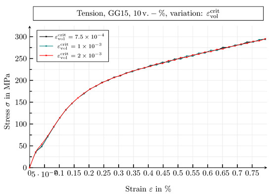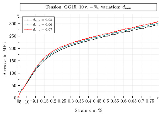 In the following, the effect of the minimum value of the degradation function, , and the threshold value of the volume change, , on the macroscopic stress–strain behaviour of one-dimensional tensile tests is investigated. The simulations are performed at room temperature, θ = 20 °C, on GJL-150 SVEs with a graphite flake volume fraction of 10 .