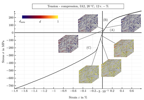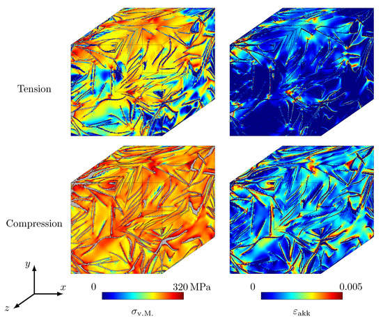 Small deformations are assumed, which means that only macroscopic strains up to should be considered in one-dimensional tensile and compression tests, in order to avoid significant kinematic errors. This critical value of the macroscopic strain is enforced in all performed simulations. Nevertheless, local regions with higher deformations can occur, which do not fulfil the mathematical requirements for the geometrical linearisation. This happens under tensile load at macroscopic strains , as some graphite lamellae act as microcracks, causing local stress and strain concentrations [12]. The neglect of the occurring geometric non-linearities is due to a minimisation of the computational costs and is justifiable, since large deformations only occur in a small region of the simulation domains.