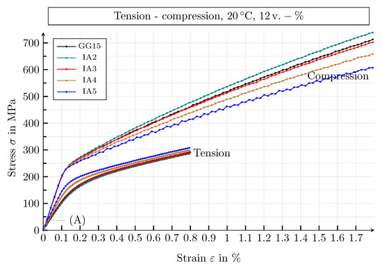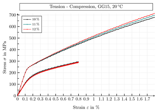 At room temperature, under tensile load, the following values result in the secant moduli of the GJL-150 SVEs: , , . This is in good agreement with the literature, where values of to , for example, are given for a GJL-150 material [50]. There is also good agreement between the Poisson’s ratio of the simulation results of the GJL-150 material under compressive loading, , and the literature, [50]. The yield strengths result in the values , and , which are comparable with values found in the literature of to [50].