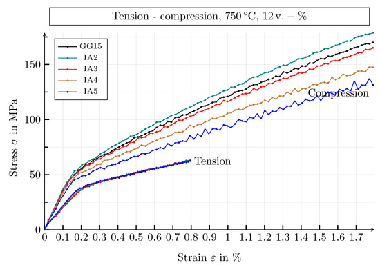 The developed model was applied in a large simulation study. The study included statistical volume elements of the graphite morphologies GJL-150 and IA2 to IA5, with 10, 11 and 12 of graphite precipitations, respectively, for a temperature range from 20 to 750 . Statistical volume elements were only used because of the computing time. Ideally, however, representative volume elements should be used. Moment-free tensile and compression tests served as mechanical load for the simulations. All material parameters used for the microscopic models refer to established values in the literature.