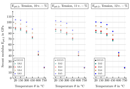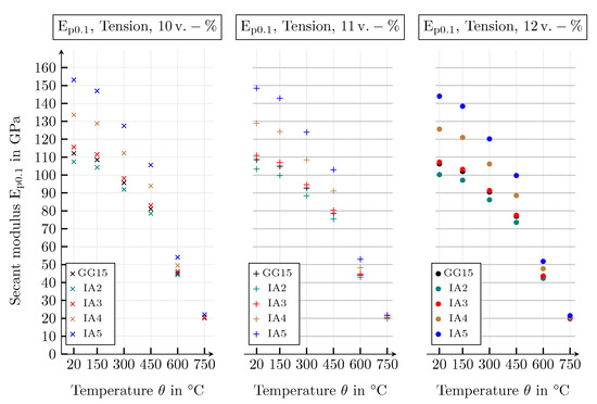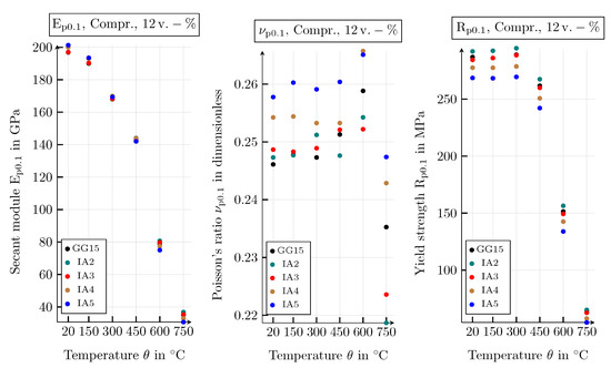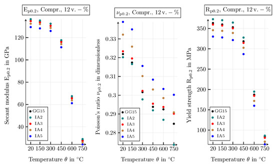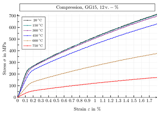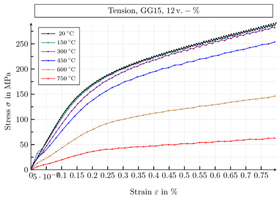 For the temperature range from 20 to 750 °C, the database, created by means of the conducted simulation study, includes the following macroscopic mechanical and thermal properties: Young’s modulus, Poisson’s ratio and the respective yield strength under tensile and compressive load, as well as the thermal conductivity. All properties are investigated by means of the specified shape and arrangement of the graphite particles, varying the size distribution of the graphite lamellae and the volume fraction of the graphite inclusions. The material parameters of the microscopic models depend on the temperature .