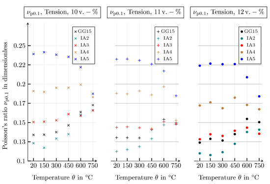 Secant moduli, Poisson’s ratios and yield strengths of all graphite classes with a graphite flake volume fraction of 12 , evaluated for the temperatures 20, 150, 300, 450, 600 and 750 , at a compressive strain of %.