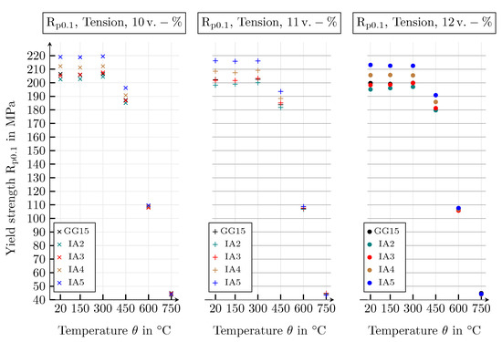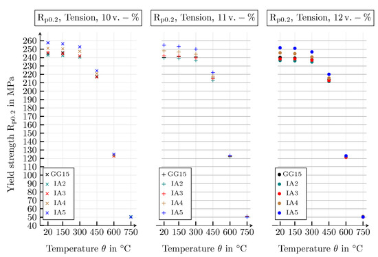 Yield strengths of all graphite classes with graphite flake volume fractions of 10, 11 and 12 , evaluated for the temperatures 20, 150, 300, 450, 600 and 750 , at a tensile strain of .