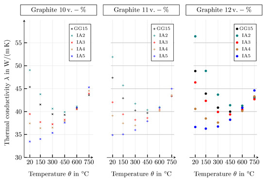 According to Hecht et al. [51], a higher thermal conductivity in structures with longer graphite lamellae is the result of a larger proportion of basal planes, available for thermal conduction. The same argumentation results in an increasing effective thermal conductivity in SVEs with an increasing quotient between the height of the lamellae and the longitudinal axes of the lamellae [3,38]. These statements are also reflected by the simulation results. In Figure 30, it can be observed that the thermal conductivity of the SVEs increases when the average size of the graphite particles increases from IA5 to IA2. As already observed in Holmgren [38], it can be seen that the thermal conductivity of grey cast iron decreases with increasing temperature.