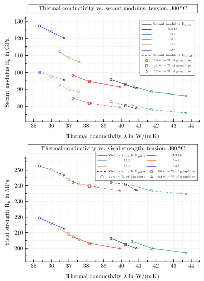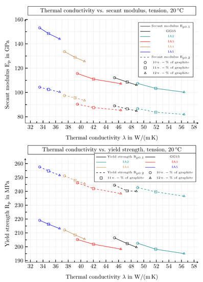 Secand moduli and yield strengths vs. thermal conductivities of all graphite classes with graphite flake volume fractions of 10, 11 and 12 at room temperature. The properties capture tensile load for strains of and .