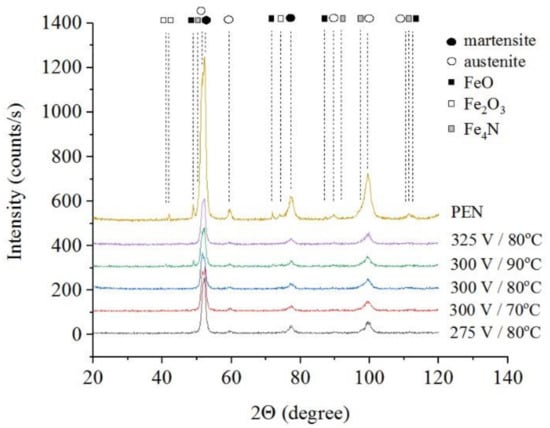 The results of X-ray diffraction analysis of the samples after PEN show the formation of FeO and Fe3O4 phases as a result of high-temperature oxidation of steel in the VGE, iron nitrides Fe4N as a result of diffusion of nitrogen, martensite and retained austenite as a result of quenching (Figure 1, Figure 2 and Figure 3). The figures also show the results of the analysis of nitrided samples after their PEP under various conditions. The intensity of iron oxides peaks after PEP decreases, while nitrides peaks remain the same, which indicates partial removal of the oxides.