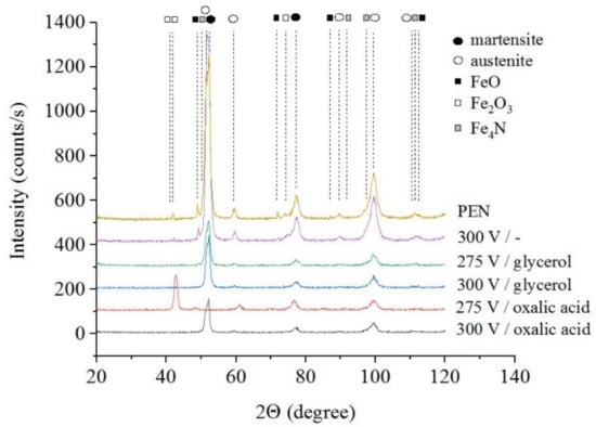 X-ray diffraction patterns of the steel surface layer after PEN and subsequent PEP in ammonium chloride (3%) solution with temperature of 80 °C without or with glycerol or oxalic acid additions (5% each) at different voltages under forced circulation of electrolyte.
