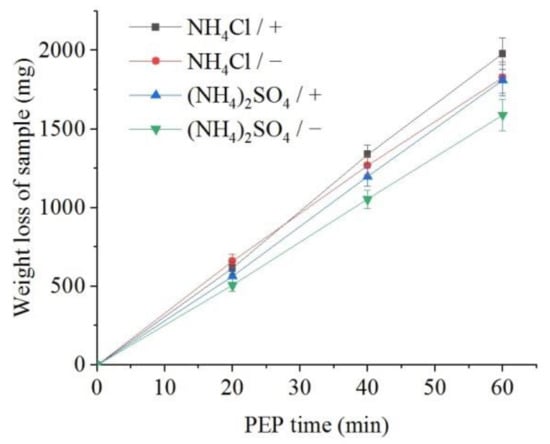 Dependence of the weight loss of the nitrided samples on the PEP duration at 300 V in ammonium sulfate (3%) or ammonium chloride (3%) solutions at their temperature of 80 °C under forced circulation (+) or natural convection (−) of electrolyte.