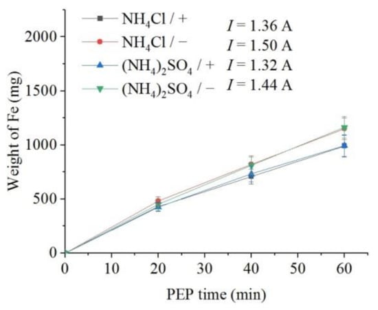 The weight loss of the samples (predominantly outer oxide layer) and the content of dissolved iron in the solution were measured. It was found that, all other things being equal, the flow of electrolyte around the samples leads to a more intensive removal of the oxide layer in comparison with the observed decrease in the sample mass under natural convection of electrolyte (Figure 6). In addition, more intense removal of material is observed during PEP in the ammonium chloride solution compared with the sulfate electrolyte. The concentration of iron (III) ions in solutions after the PEP is noticeably lower than the decrease in their weight (Figure 7). Therefore, the difference in these weights corresponds to the weight of oxygen contained in the removed oxide layer. In contrast to the weight loss, the amount of iron in the solution after the PEP without electrolyte circulation exceeds that when the electrolyte flows around the samples. This regularity is observed in both sulfate and chloride electrolytes.