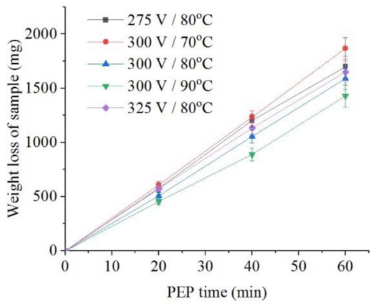 Dependence of the weight loss of the nitrided samples on the PEP duration in ammonium sulfate (3%) solution under natural convection of electrolyte conditions at different voltages and electrolyte temperatures.