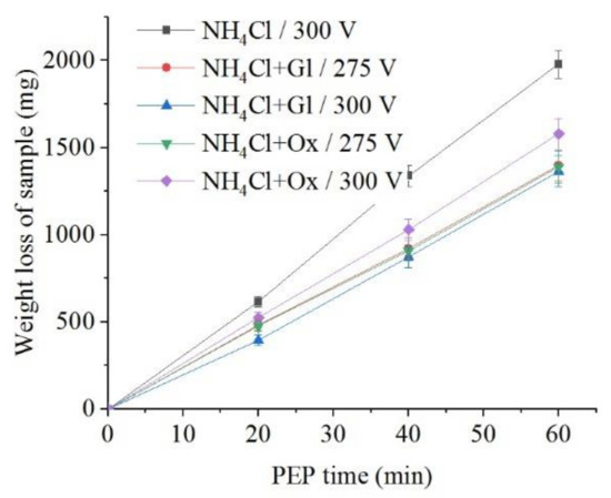 Dependence of the weight loss of the nitrided samples on the PEP duration in ammonium chloride (3%) solution at a temperature of 80 °C without or with glycerol or oxalic acid additions (5% each) at different voltages under forced electrolyte circulation.